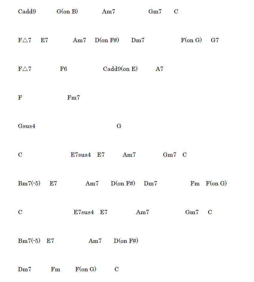 もちろん、add9やonコード、△7、m7、sus4、m7(-5)などを省略したり簡略化したりはしません。